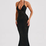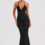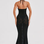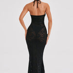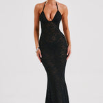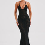 Pronta para uma dose de romance sombrio? Conheça Leilina, um maxi sedutor confeccionado em nossa renda floral elástica premium que se molda ao seu corpo, proporcionando a silhueta dos sonhos. Com um decote profundo e copas com aro, o design é semi-transparente e fica incrível combinado com cabelo liso e saltos altos.