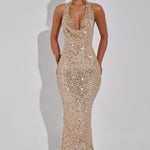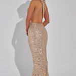 Você irá brilhar a noite toda com o vestido maxi Lorena. Um design luxuoso em rede de lantejoulas com uma aparência levemente transparente, este vestido é forrado em malha e apresenta alças de halter com um decote baixo e costas em formato de gota. Ele cai lindamente com uma costura diagonal na saia. Combine com uma maquiagem radiante e cabelo liso.