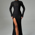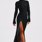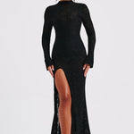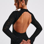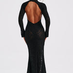 Tudo é sobre o drama de Lourdes, nosso vestido deslumbrante todo em renda, com uma saia maxi que arrasta no chão. Com um elegante decote alto, longas mangas flare e costas com recorte baixo, este design é feito em renda floral transparente premium e possui um bodysuit removível por baixo. Use com o cabelo preso em um coque solto, maquiagem radiante e saltos plataforma.