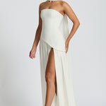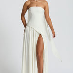 Entregue-se ao luxuoso Vestido Maxi Maliyah em Marfim. Com um corpete justo de crepe e saia de chiffon, este vestido exala sofisticação. A barra assimétrica e as costas com amarração adicionam um toque de glamour, enquanto a saia cheia e franzida e a fenda alta proporcionam uma sensação de elegância sem esforço. Perfeito para qualquer ocasião especial.