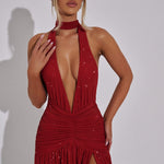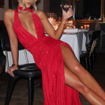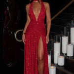 Delicie-se com o puro luxo do nosso Vestido Maxi Melania em Vermelho Brilhante. O tecido de malha elástica brilhante se ajusta perfeitamente à sua silhueta, enquanto o decote halter profundo e as costas baixas adicionam um toque sedutor. Os quadris ajustados com franzido e a saia solta com fenda alta criam uma silhueta deslumbrante. Faça uma declaração no seu próximo evento com este vestido maxi exclusivo.