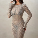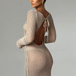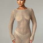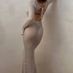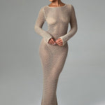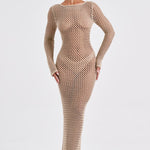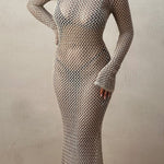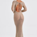 Dias longos e quentes que se transformam em noites pedem Moana, nosso vestido maxi de malha transparente premium com um impressionante decote nas costas e gola alta. Este design deslumbrante é super favorecedor com mangas longas e punhos flare. Combine com cabelos suaves e texturizados, acessórios dourados e sandálias de salto.