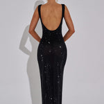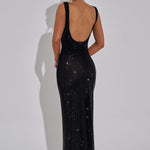 Delicie-se com o luxo do Vestido Maxi Petra em Preto. Feito de rede elástica premium adornada com strass hotfix, sua aparência semi-transparente e malha totalmente forrada proporcionam um toque elegante. O decote quadrado e as costas baixas adicionam sofisticação, enquanto o zíper invisível e o comprimento maxi criam uma silhueta atemporal.