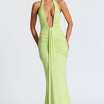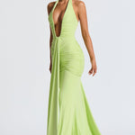Eleve seu estilo com o Vestido Maxi Rosetta na vibrante cor lima. Confeccionado em jersey fluido, este vestido apresenta um decote halter profundo com um arame em formato de U para um toque de luxo. O franzido no decote e no quadril adiciona um detalhe sutil, enquanto a saia cheia com cauda e o longo painel drapeado na parte frontal central exalam elegância.