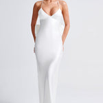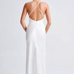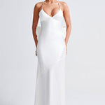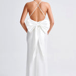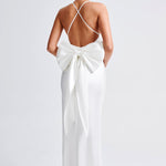 Fique e sinta-se angelical no seu grande dia com o Sarita. O corte é simples e limpo, com copas em formato de triângulo, alças cruzadas e um elegante, mas sexy, decote nas costas. O cetim liso e macio se ajusta à sua figura e o laço removível é o toque final perfeito. Combine com saltos brancos para o seu look mais romântico até agora.