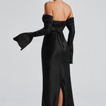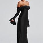 Fique obcecada pelo Selene, um design elegante em corte enviesado feito de nosso luxuoso cetim texturizado que se ajusta lindamente à figura. Com um decote bardot de painel torcido e mangas longas e flare, este estilo maxi é finalizado com um laço na cintura nas costuras laterais. Combine com saltos tonais e ondas suaves.