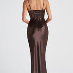 O Vestido Maxi Shae na cor Marrom Ameixa exala elegância e sofisticação. Confeccionado em luxuoso cetim não stretch, este deslumbrante vestido apresenta copas plissadas e alças ajustáveis em formato de leque que emolduram lindamente o decote. A parte traseira com amarração adiciona um toque de sedução, enquanto as costelas no corpete proporcionam estrutura e suporte. Uma delicada sobreposição de corpete na frente realça a estética refinada e feminina do vestido.