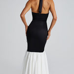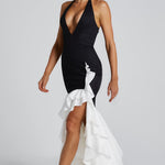 O Vestido Maxi Veronique em Preto com Barra Branca é uma peça impressionante. Com um decote halter profundo que amarra elegantemente na parte de trás do pescoço, este vestido exala charme enquanto proporciona estrutura com apliques no corpete para um ajuste lisonjeiro. O comprimento maxi é elevado por babados volumosos em cascata na barra.