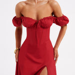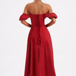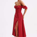 Os midis estilo leiteira são o que estamos usando TODA a temporada com ondas elegantes e saltos mule. Courtney tem mangas bufantes dos sonhos que você pode usar nos ombros ou fora deles, com uma cintura ajustada e um lindo detalhe de laço no busto. O look é completado com uma saia volumosa e uma fenda alta na coxa.