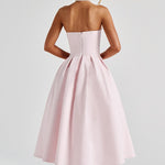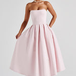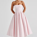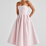 O Vestido Midi Edith na cor Rosa é o epítome da elegância, projetado para fazer uma declaração em qualquer ocasião. Esta beleza sem alças apresenta estrutura de apliques no corpete, oferecendo um ajuste lisonjeiro e de suporte. A saia cheia, confeccionada com pregas box invertidas na cintura, cria uma silhueta deslumbrante que se move graciosamente a cada passo. Se você está indo a um casamento, aniversário ou evento especial, este vestido combina estilo atemporal com sofisticação moderna.