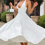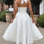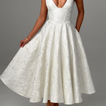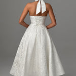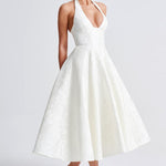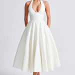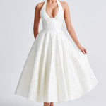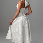 Um vestido deslumbrante que exala elegância romântica e atemporal - conheça Effie. Oferecendo uma silhueta sofisticada, apresenta uma saia midi cheia feita de tule para maior volume, e um corpete super justo com aros para definir a cintura. Com um decote halter profundo e costas com amarração para um ajuste perfeito, é confeccionado em nosso luxuoso jacquard floral que é super feminino e clássico.