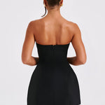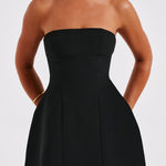Simples e seriamente chique, o vestido mini Asha é a obsessão desta temporada. Perfeito para usar em noites de encontro, festas até tarde e além, este design sem alças é finalizado com detalhes de costura e uma saia em formato de bolha para um volume extra.