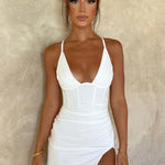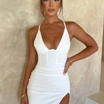 Sinta-se super ajustada no vestido mini Aura, feito em nosso novo tecido de algodão stretch com um topo estilo corpete para marcar a cintura. Este vestido divertido e provocante possui um busto com aro, plissado, alças finas e uma fenda alta na coxa.