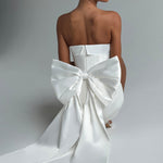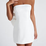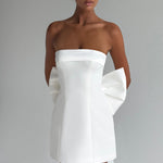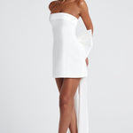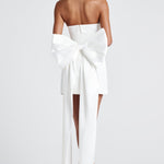 Chame a atenção com o Vestido Mini Barbara em Marfim. Este destaque apresenta um decote tomara que caia elegante com um luxuoso painel de cetim contrastante, enquanto um laço de cetim oversized com caudas dramáticas rouba a cena. Feito de crepe não stretch, a saia tulipa refinada adiciona a quantidade certa de estrutura. Chic, provocante e feito para se destacar.