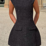 Obsessão atual: tweed. Blake é super divertido e sofisticado, confeccionado em nosso luxuoso tweed texturizado e projetado com uma saia em forma de bolha. O vestido mini é completo com um decote alto com pregas, bolsos falsos com aba e um detalhe de recorte em forma de chave nas costas.