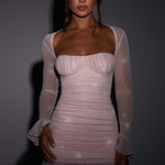 Prepare-se para sair com o Brea, nosso mini vestido principal feito em uma malha brilhante de luxo premium com detalhes franzidos por toda parte. As longas mangas bonitas são transparentes com punhos flare, enquanto o busto é estruturado com aro para dar forma e levantar o decote. Use o seu com ondas soltas, uma manicure brilhante e mules de salto alto.