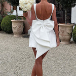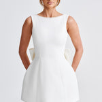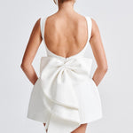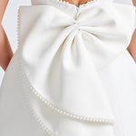 Tudo está nos detalhes. Carrie é um design que está esperando para ser seu para sempre, uma peça deslumbrante de noiva perfeita para sua despedida de solteira, brunches e festas de casamento. Projetado pensando em você, entre em seu próximo capítulo com este mini vestido de crepe luxuoso, feito com uma saia em forma de bolha e um laço adornado com pérolas que é destacável. Este estilo impressionante é completado com pérolas que enfeitam a gola alta e larga e as costas curvas.