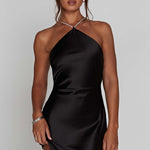 Chiara é o nosso deslumbrante novo vestido mini feito de cetim premium que se ajusta ao corpo, abraçando a cintura e abrindo suavemente na barra. Com um decote alto marcante, o vestido é completado com um sexy decote nas costas e alças brilhantes decoradas que amarram nas costas. Combine-o com saltos decorados, uma bolsa metálica e maquiagem brilhante.