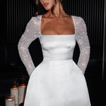 Sinta-se como uma boneca no Dolly, nosso novo vestido mini favorito feito com um corpo de cetim e mangas longas em malha elástica, adornadas com contas. Este design ultra fofo ajusta-se na cintura e se abre em uma saia em forma de bolha divertida, finalizada com um fechamento de amarração nas costas para um ajuste perfeito.