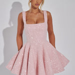 Obsession atual: tweed. Dorothy é super divertida, mas sofisticada, confeccionada em nosso luxuoso tweed de paetês com uma saia em círculo completo. O vestido mini é completo com um decote quadrado, alças ajustáveis, costuras princesa no corpo e um laço removível nas costas.