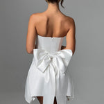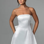 O vestido mini Freja é a perfeição para festas. Feito em luxuoso cetim stretch, este lindo design é sem alças, com um corpete estruturado e uma saia rodada e divertida. Um laço dramático nas costas completa o visual.