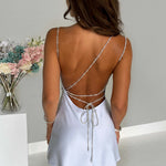 O vestido mini Glacia é garantido para chamar a atenção. Feito em nosso luxuoso cetim pesado com stretch para conforto, este vestido se ajusta ao corpo como nenhum outro, completo com um corte costas nuas e alças ajustáveis para cinchar a cintura. Eleve seu look com saltos finos e acessórios prateados.