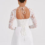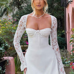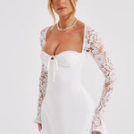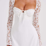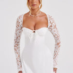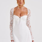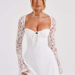 Sonhando com detalhes delicados e sutis? Conheça Jacinta, seu novo vestido mini favorito feito em renda floral elástica de luxo com mangas longas e flare, busto com copas e detalhe amarrado. Este design inspirado nas leiteiras será seu favorito durante toda a temporada, seja estilizado com botas até o joelho para um brunch sem fim ou plataformas altas para sua próxima noite de encontro.