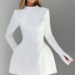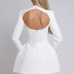 A Kelly está aqui para te vestir para a nova temporada e grandes sonhos. Este mini chique é feito de crepe premium, com mangas longas e um decote alto com pregas. Possui um recorte em forma de chave nas costas e é completo com bolsos embutidos e saia em formato de bolha. Combine com saltos pontudos e uma bolsa mini tonal.