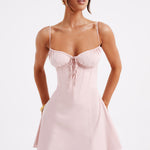 Mais um vestido mini bonito para adicionar à sua coleção, o vestido Lacey é feito em nosso tecido de algodão super leve e luxuoso, com uma saia volumosa e um corpete que afina a cintura. O look é completado com copas com aro e um delicado laço no busto.