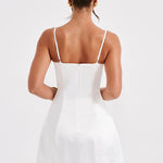 Use o Lainey para todas as suas soirées, encontros de brunch e festas no jardim nesta temporada. Cortado em nosso luxuoso cetim stretch que possui um brilho bonito, este mini vestido fofo tem copas em formato de triângulo com um acabamento em renda e saia em formato A. O look é completado com um delicado laço no centro do busto. Estilize o seu com joias douradas e sapatos mule.