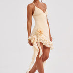 Não há nada mais elegante do que o Lilabelle, confeccionado em nossa malha dupla stretch premium que se ajusta ao corpo como uma luva. Com um decote profundo e uma barra assimétrica flertante com camadas de babados em cascata, o mini é completado com detalhes de corsage de flores brincalhonas.