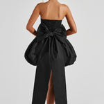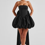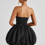 Roube a cena com o nosso vestido mini Lotus. Feito de um tecido tafetá texturizado de alta qualidade, este mini foi projetado para máximo drama. Esta obra-prima sem alças apresenta uma saia volumosa em formato de puff-ball com delicadas pregas na cintura, criando uma silhueta volumosa e chamativa. A costura da cintura em V, o corpete estruturado e as costas com amarração garantem um ajuste escultural e lisonjeiro. O Lotus é complementado com um laço removível com longas pontas, adicionando um toque marcante que pode ser retirado para mudar seu visual.