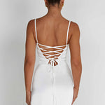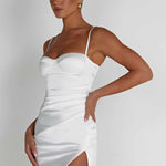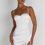 Mabel é o nosso mini indispensável desta temporada. Feito de um luxuoso cetim stretch, o minimalista e elegante Mabel possui um decote halter que valoriza o busto, com copas com aro para moldar a sua silhueta, finalizado com uma fenda alta na coxa. Use o seu com mules discretas para uma festa ou ocasião especial.