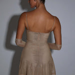 Cor: Brilho Dourado. Malha de brilho suave com elasticidade. Copas com aro. Ajuste que abraça o corpo e se adapta à figura. Fenda na perna. Alças super finas. Comprimento mini. \r"}' data-sheets-userformat='{"2":15105,"3":{"1":0},"11":4,"12":0,"14":{"1":2,"2":0},"15":"Arial","16":11}'>Cor: Brilho Dourado.