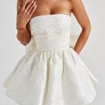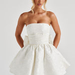 O Vestido Mini Salome em Marfim é a combinação perfeita de elegância e charme, projetado para aquelas ocasiões especiais em que você deseja se destacar. Confeccionado em um lindo tecido jacquard floral, este vestido sem alças apresenta um corpete plissado com estrutura interna para proporcionar uma silhueta ajustada e feminina. A saia ampla adiciona volume, enquanto as costas com amarração garantem um ajuste personalizável. Finalize o look com o laço oversized removível nas costas. Combine com saltos delicados e acessórios para um visual sofisticado.