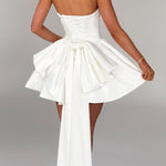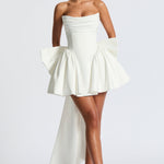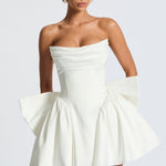O Vestido Mini Trinity em marfim é a combinação perfeita de elegância e diversão. Seu tecido de cetim stretch e as armações no corpete proporcionam um ajuste lisonjeiro, enquanto a saia cheia e os painéis godê plissados adicionam movimento lúdico. O laço destacável com longas caudas nas costas acrescenta um toque peculiar a este vestido sem alças com decote arredondado e costas com amarração.
