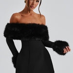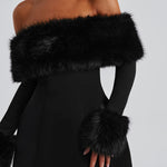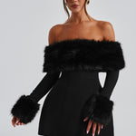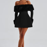 Apresentamos nosso design mais fofo e aconchegante da temporada, Villanelle. Feito com um decote e punhos de pelúcia sintética, o vestido mini tem mangas longas e uma saia em forma de bolha divertida.