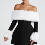 Arrojado, glamouroso e effortless chic, o Vestido Mini Villanelle é uma peça de destaque com um apelo atemporal. Feito de crepe premium sem elasticidade, este vestido apresenta um decote Bardot lisonjeiro e mangas longas, complementado por detalhes luxuosos em pelúcia sintética no decote e nos punhos. A saia em forma de bolha arredondada cria uma silhueta divertida e lisonjeira.